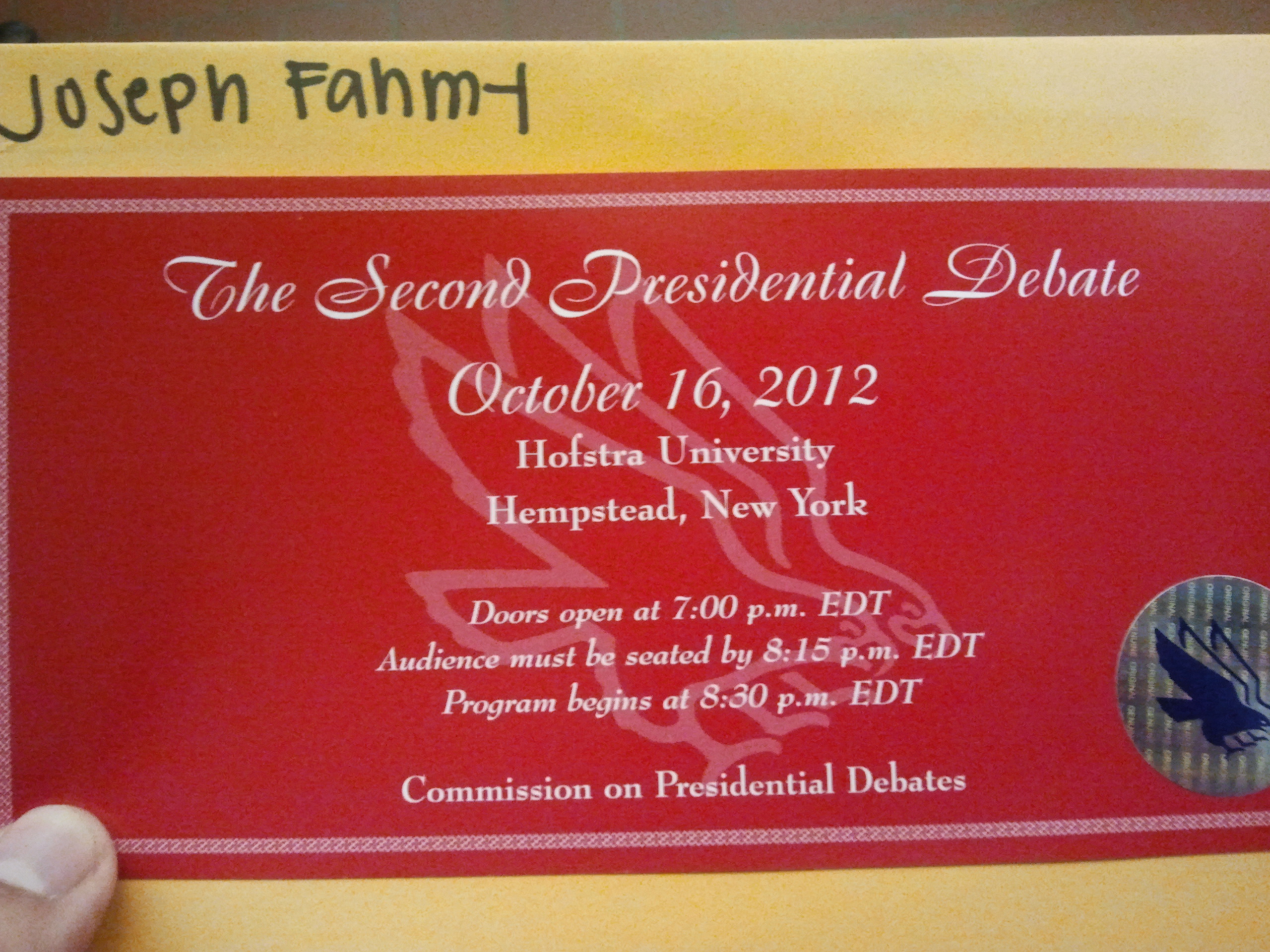 I was very fortunate to get a ticket to the Second Presidential Debate on October 16, 2012. While waiting in line to get in, I started talking to 2 Hofstra University students (1 male, 1 female) who won tickets to the event through the student lottery. For 30 minutes, we were laughing our asses off! I felt like a stand-up comedian and the 2 students were in tears laughing during our conversation…until the most horrible question came up…who are you voting for?