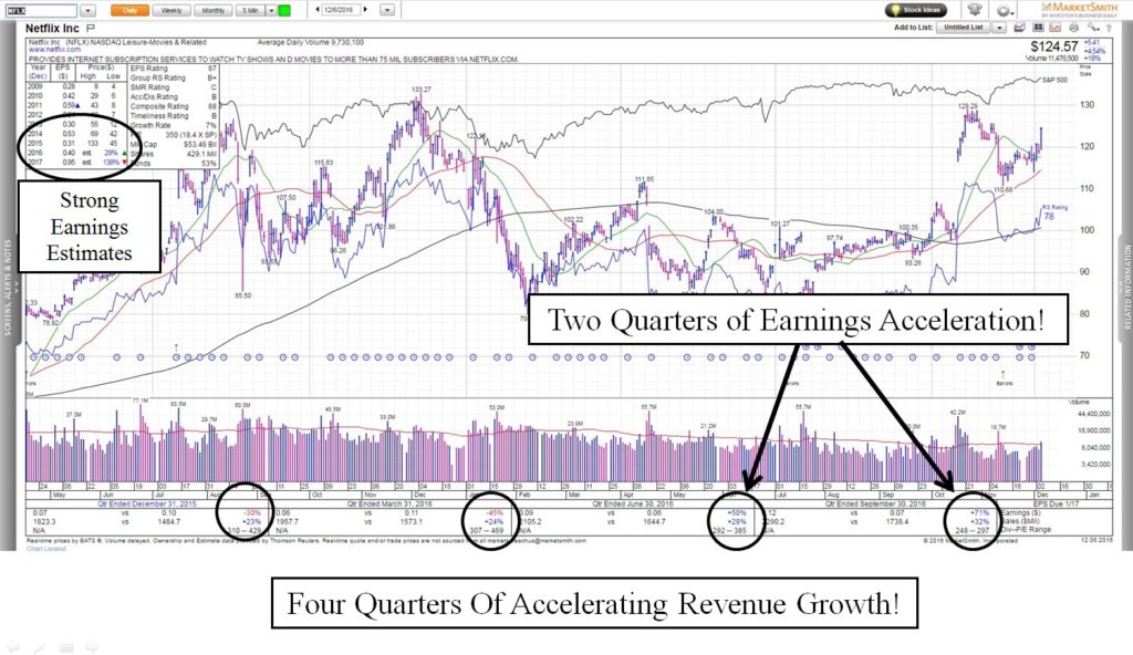 2) Fundamentals – The company has posted four quarters of accelerating revenue growth and two recent quarters of over 50% earnings growth (see below). Their subscriber growth still has huge potential domestically and internationally, especially if they team up with other providers for distribution, content and sports programming.