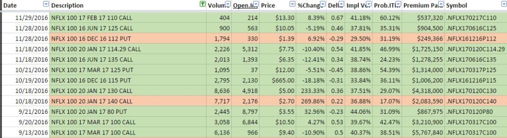 3) Option activity – There has been recent bullish call option activity, notably in March 100 calls and Jan 2017 130/140 call spreads (see below). Data provided by OptionsHawk. Check out his website for more great options activity.