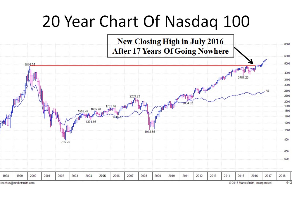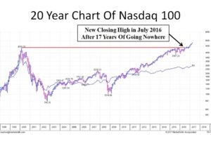 Technicals – Weekly volume is important to monitor because the big funds control the market. The major indexes continue to show that institutions are accumulating stock. For the most part, they are buying stock on the positive weeks and selling very little on the down weeks. This isn’t limited to the US markets. The global boom is being confirmed by new highs in many international markets. In the US, the leading growth index is the Nasdaq 100 and you can see in the chart below that it JUST broke out in July 2016 after going nowhere for almost 17 years!