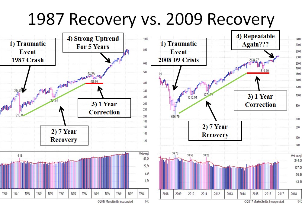 At the beginning of 1995, if someone said the Dow Jones would climb from 4,000 to almost 12,000 in the next 5 years, no one would believe it. Why? Because the crash of 1987 was still fresh in investor’s minds and the recovery was already 8 years long. Sound familiar? The correlation to today is that the Financial Crisis of 2008-09 is still fresh in people’s minds and the recovery has already lasted 8 years. Most people can’t even consider the possibility of the market going significantly higher from here because, according to the media, this 8 year recovery is “long in the tooth” and about to end. However, I have made the argument for ten months now that we resumed a NEW Bull Market in July 2016 (that really began in Jan 2013, NOT March 2009). Very few people want to talk about the Bear Market that recently happened from mid 2015 to mid 2016 where the average stock corrected over 20% and many of the leading sectors corrected between 25-50%. A similar thing happened from early 1994 to early 1995 BEFORE the market went on a strong run as shown below: