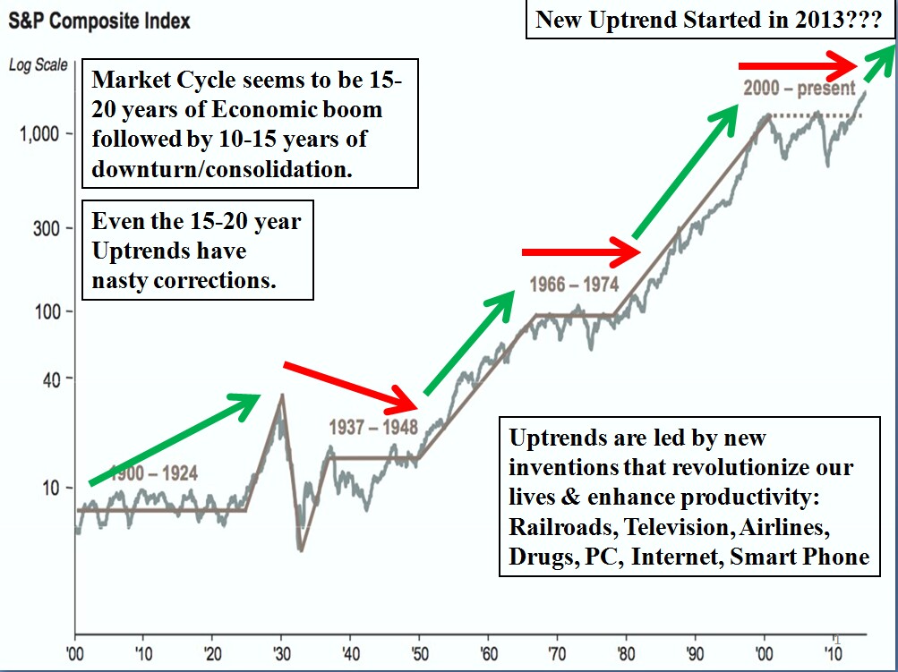 There is a constant theme in the financial media that this Bull Market is about to end any day now. I believe it still has a long way to go. It’s not going to continue straight up and we’ll experience plenty of corrections along the way. Ultimately, it will end with a “blow off” move to the upside where everyone just throws in the towel. I don’t know if this will happen three months or three years from now, but I am leaning towards the latter because it will take a long time for investors to change their mentality. I’m basing my thesis on technicals, fundamentals and investor sentiment. (I could write 10 pages on each of these topics but I will do my best to focus on the major points).