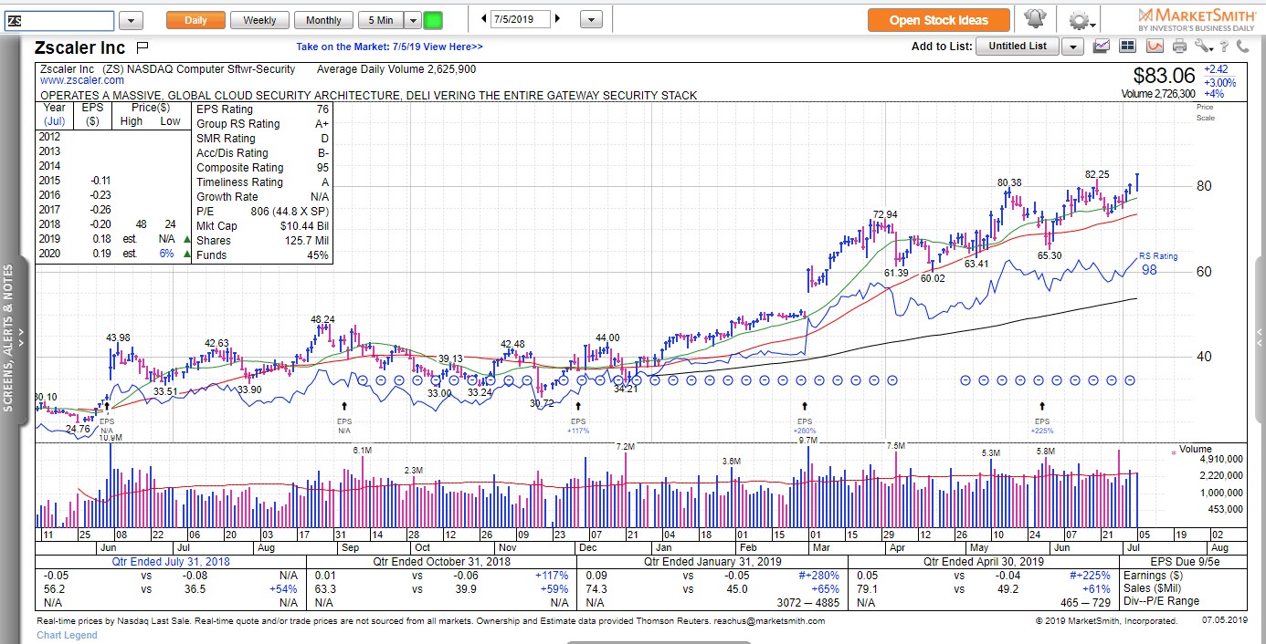 1) Zscaler (Symbol: ZS) is a cloud security software company. Technically, the stock is forming an ascending base. Fundamentally, they are growing revenues at over 60% and increasing their earnings at a triple-digit rate. I have mentioned this stock several times on Twitter in the $40-$50 range, but I still think it has strong potential based on bullish option activity and its total addressable market.